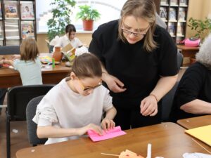 В Красноярской краевой спецбиблиотеке прошли мероприятия Библионочи на центральную тему акции этого года «Единство народов – сила России!». Локации первого этажа встречали гостей народными песнями под баян, игрой в определение национальности мелодии по звучавшему музыкальному фрагменту, масштабной книжной выставкой «Единство народов России». Наибольшее оживление наблюдалось на втором этаже, где на площадках организовали мастер-классы по бумагопластике от представителей Детской школы искусств № 15, лепке из воздушного пластилина, созданию сувениров в тематике Года единства народов России и блокнотов с подборкой информации о культуре и традициях того или иного народа, дополненной иллюстрациями национальных костюмов. Любой желающий мог украсить себя аквагримом от профессионального художника. Здесь же проходила презентация издания «Путеводитель по библиотеке» с параллельным определением помещений учреждения по их стихотворному описанию и тактильным выстраиванием на макете заданных маршрутов по зданию. На площадке «Разные языки — одна душа», разместившейся в тифлоэкспозиционном зале, красноярский писатель, член Союза писателей России Иса Айтукаев рассказывал присутствующим о своей жизни, литературном творчестве и отражении в нём национальных традиций родной Чеченской Республики, прочёл авторский рассказ. Здесь же демонстрировались видеозаписи декламации стихотворений хакасскими и тувинскими поэтами на национальных языках и в переводе на русский.